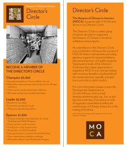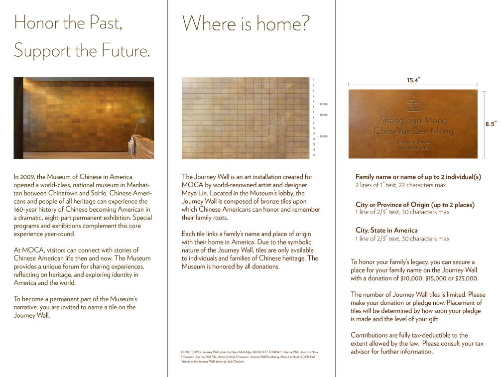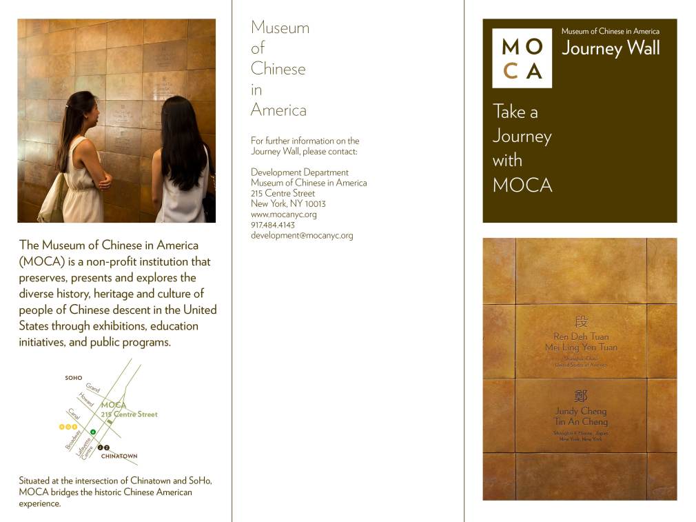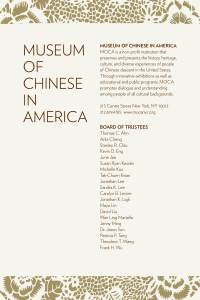 Founded in 1980, the Museum of Chinese in America (MOCA) is dedicated to preserving and presenting the history, heritage, culture and diverse experiences of people of Chinese descent in the United States. Through my role at Maya Lin Studio, I developed print materials for MOCA such as award invitations, posters, museum brochures, development packets, and membership appeals.